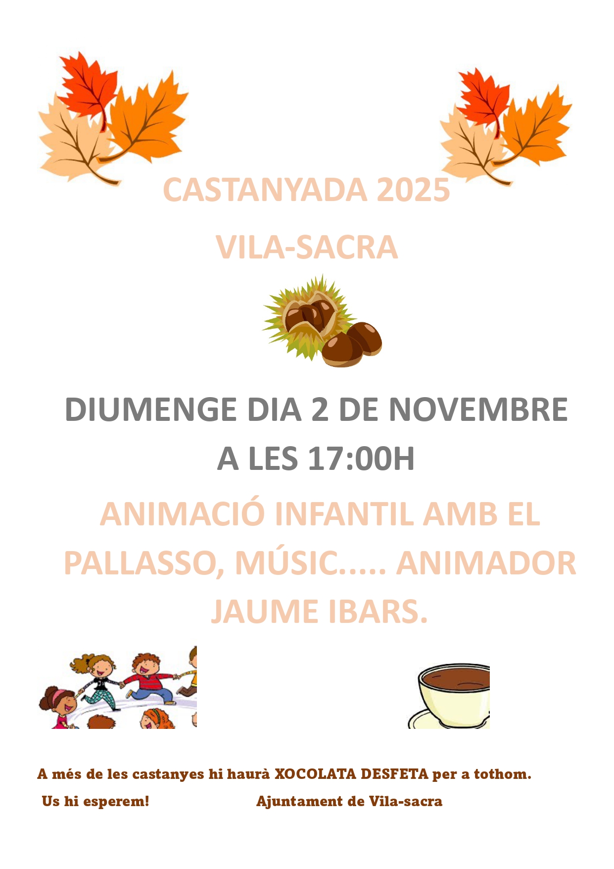 Dia 31 d'octubre de 2025Castanyada 2025 Animació infantil amb el pallasso, músic i animador: Jaume Ibars. A més de les castanyes hi haurà XOCOLATA DESFETA per a tothom. Us hi esperem!