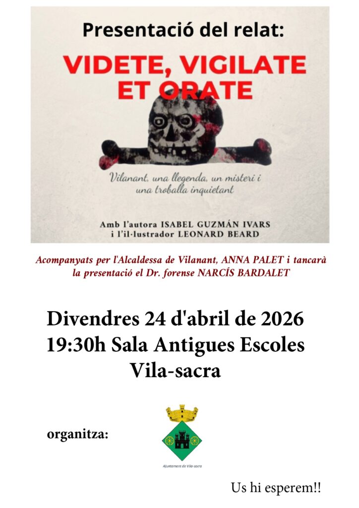 Vilanant, una llegenda, un misteri i una troballa inquietant. Amb l’autora Isabel Guzmán Ivars i l’il·lustrador Leonard Beard. Acompanyats de l’Alcaldessa de Vilanant Anna Palet i tancarà la presentació el Dr. forense Narcís Bardalet.