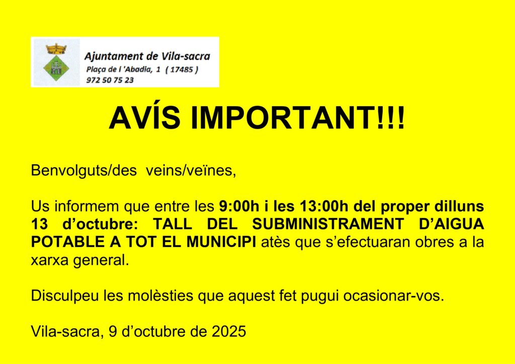 Us infomem que entre les 9.00 hores i les 13.00 hores del proper dilluns 13 d’octubre: TALL DEL SUBMINISTRAMENT D’AIGUA POTABLE A TOT EL MUNICIPI atès que s’efectuaran obres a la xarxa general.